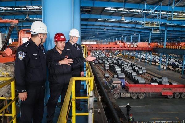 正在山东口岸日照港岚山港区,日照边检坐移平易近办理和日照海关检验关员结合检验进口原木。钱程/摄。