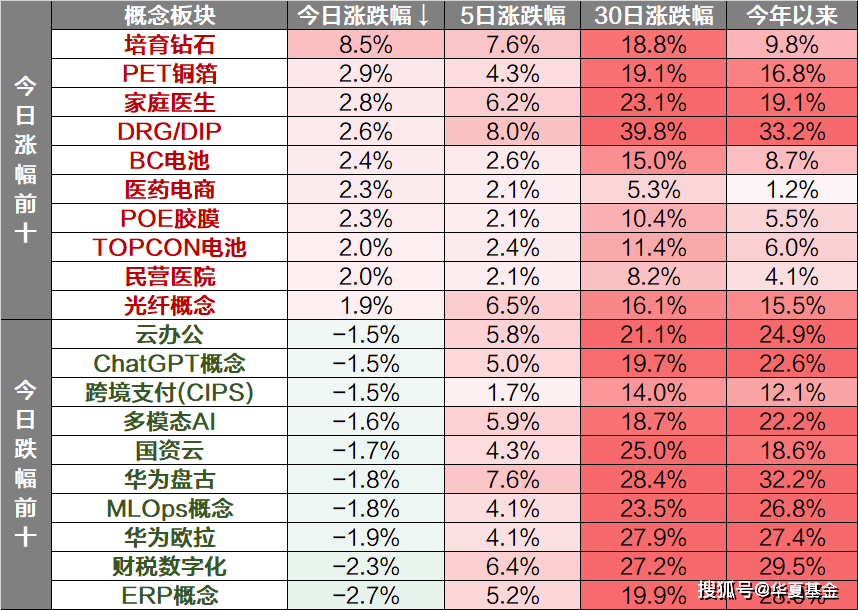 概念从题上看,培育钻石、PET铜箔、家庭大夫概念 领涨,ERP概念、财税数字化、华为欧拉概念领跌 。