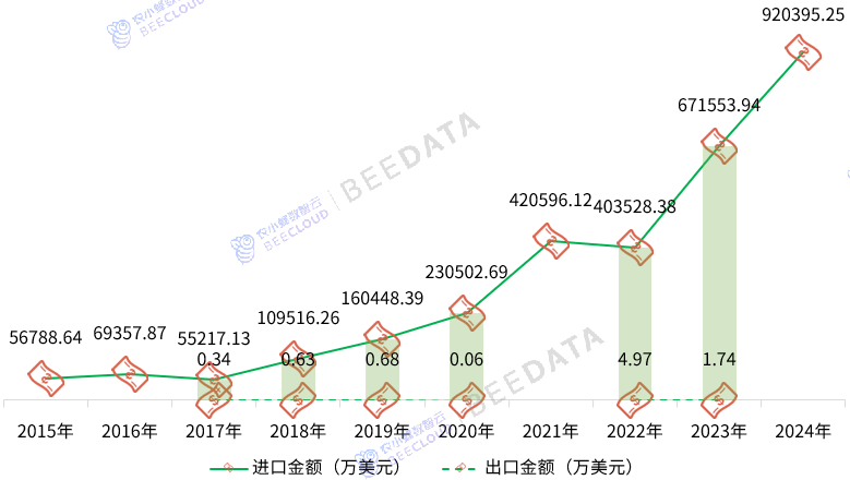 从进出口商业量来看,2015年至2024年,中国榴莲进口量增加了1763720。21吨(约合176。37万吨),增幅约为590。28%,年均复合增加率约为23。94%;近十年间中国仅正在2017年~2020年、2022年~2023年6年有榴莲出口,中国榴莲进出口商业常年呈净进口态势;且因为2015年、2024年,中国均无榴莲出口,中国榴莲净进口量及净进口金额取榴莲进口量及进口金额的增幅取增速均连结分歧。