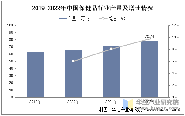 现在,人们对健康的注沉导致了对保健品的需求日益强烈,保健操行业的产量也逐年升高,据统计中国保健操行业产量由2019年的62。7万吨增加至2022年的78。74万吨,增加幅度25。6%,复合增加率为7。9%,2022年同比增加9。7%。估计正在将来保健操行业产量将照旧不变增加。