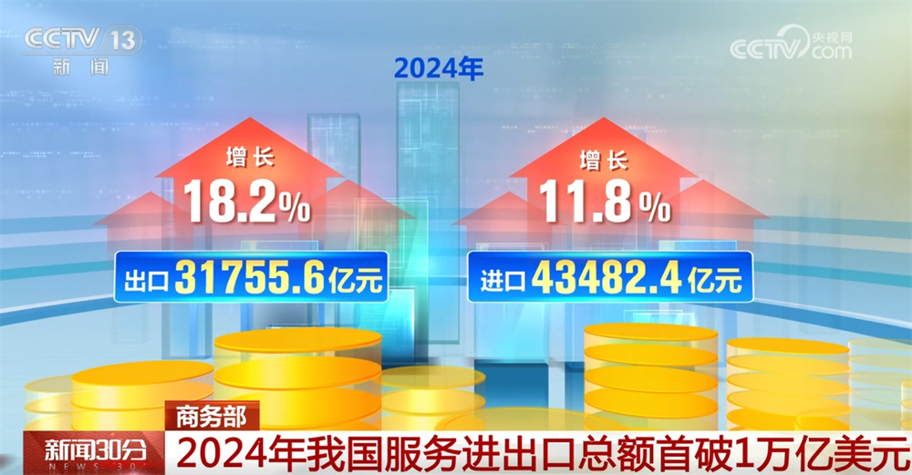 商务部数据显示,2024年,我国办事商业实现快速增加,全年办事进出口总额初次冲破1万亿美元,规模创下汗青新高,布局持续优化,展示出广漠的成长潜力。2024年,中国全年办事进出口总额75238亿元,同比增加14。4%。此中,出口31755。6亿元,增加18。2%;进口43482。4亿元,增加11。8%;办事商业逆差11726。8亿元,